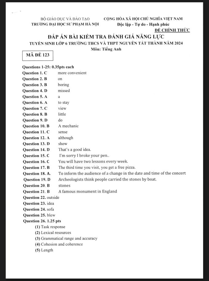 1. Đáp án đề tham khảo thi vào lớp 6 môn Tiếng Anh Nguyễn Tất Thành 2025 chính thức