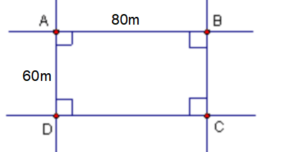 Một người muốn đi từ góc B đến góc D thì đi theo đường thẳng từ B đến D là ngắn nhất, độ dài đường đi là độ dài đoạn thẳng BD. Áp dụng định lý Py ta go vào tam giác vuông ABD ta có: BD2 = AB2 + AD2 = 802 + 602 = 10 000 BD = 100. Vậy độ dài đường ngắn nhất đi từ B đến D là 100m.