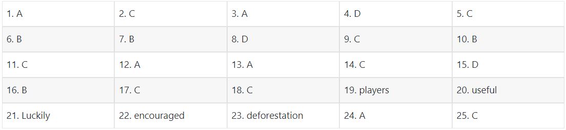 | 1. C | 6. D | 11. A | 16. B. loves | 21. heavily | 26. D. that | 31. D |