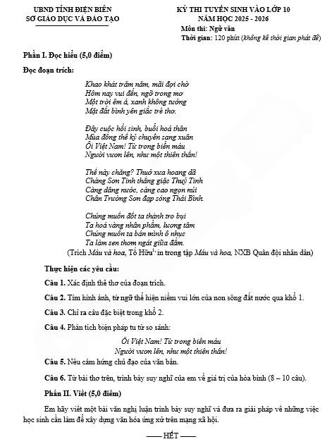 Đề thi vào 10 môn Văn tỉnh Điện Biên, đề thi vào 10 trường phổ thông dân tộc nội trú tỉnh Điện Biên 2025 cùng với đáp án đề thi tuyển sinh lớp 10 môn Văn tỉnh Điện Biên 2025 đều là những câu hỏi được rất nhiều các em học sinh quan tâm. Sau đây là nội dung chi tiết đề thi và đáp án môn Văn vào lớp 10 tỉnh Điện Biên mới nhất Hoatieu xin chia sẻ đến bạn đọc.
