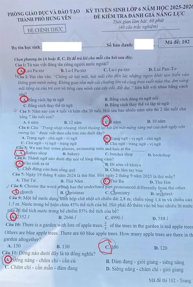 Đề thi vào lớp 6 Chất lượng cao Thành phố Hưng Yên năm 2025 - 2026