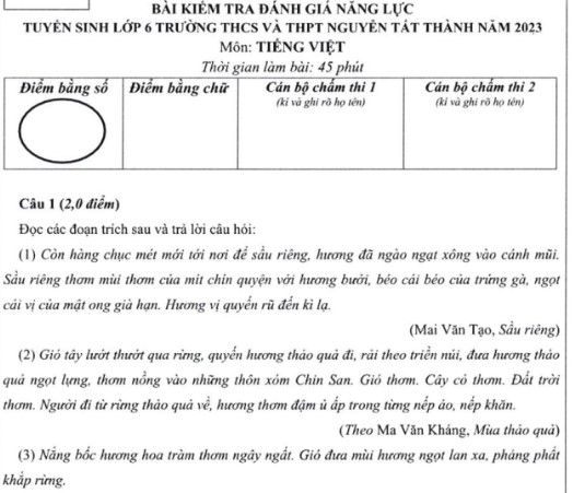 Bài kiểm tra ĐGNL Tiếng Việt, xét tuyển vào lớp 6 Trường THCS&THPT Nguyễn Tất Thành 2024: