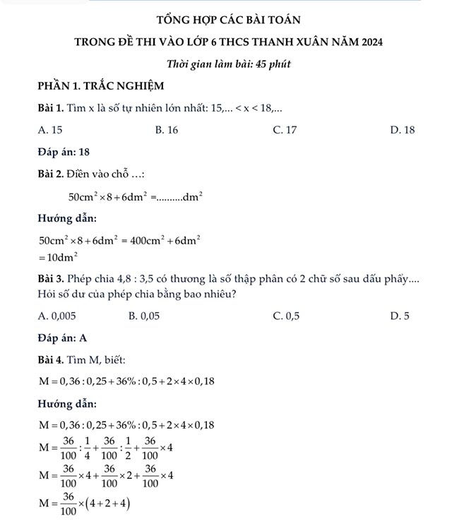 Tổng hợp đề thi Toán vào lớp 6 trường THCS Thanh Xuân