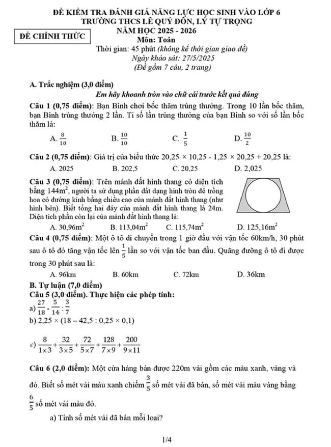 1. Đề thi vào lớp 6 trường THCS Lê Quý Đôn, Lý Tự Trọng năm 2025-2026