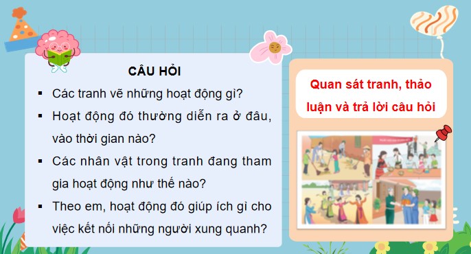 + Tranh vẽ hoạt động gì? + Hoạt động đó thường diễn ra ở đâu, vào thời gian nào? + Các nhân vật trong tranh đang tham gia hoạt động như thế nào? + Theo em, hoạt động đó giúp gì cho việc kết nối những người xung quanh? |