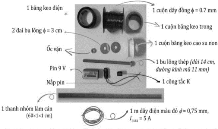 - Nguồn điện 9V và nắp pin - Dây điện - Bu lông thép (dài 14cm, đường kính mũ 11 mm) - Cuộn dây đường kính 0,7mm - Thanh gỗ hoặc thanh nhôm - Băng keo trong - Băng keo cao su non - Kéo - Bìa cát tông |