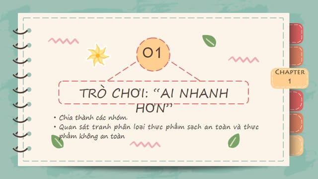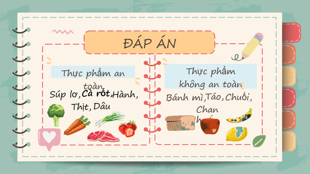 - Nhiệm vụ: Học sinh quan sát tranh các thực phẩm giáo viên trình chiếu phân loại nhanh thực phẩm an toàn và thực phẩm không an toàn vào phiếu bài tập.