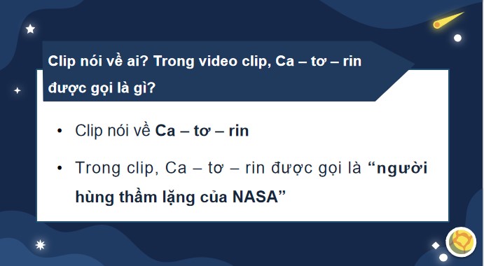 - Đọc thành tiếng trôi chảy toàn bài. Phát âm đúng các tên riêng nước ngoài (Ca-tơ-rin, NASA); các từ ngữ có âm, vần, thanh mà HS địa phương dễ bị sai. Ngắt nghỉ hơi đúng. Tốc độ đọc khoảng 80 - 85 tiếng/phút. Đọc thẩm nhanh hơn đầu học kì I.