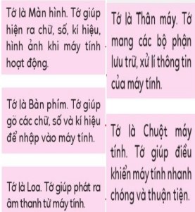 - Nhận ra và phân biệt được các thành phần cơ bản của máy tính: thân máy, bàn phím, chuột và màn hình.