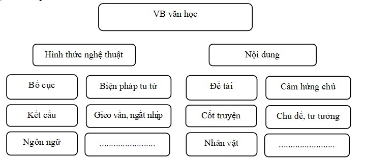 (2) Nhóm 4, 5 HS quan sát sơ đồ sau và điền mũi tên vào sơ đồ thể hiện mối quan hệ giữa các yếu tố của VB văn học: