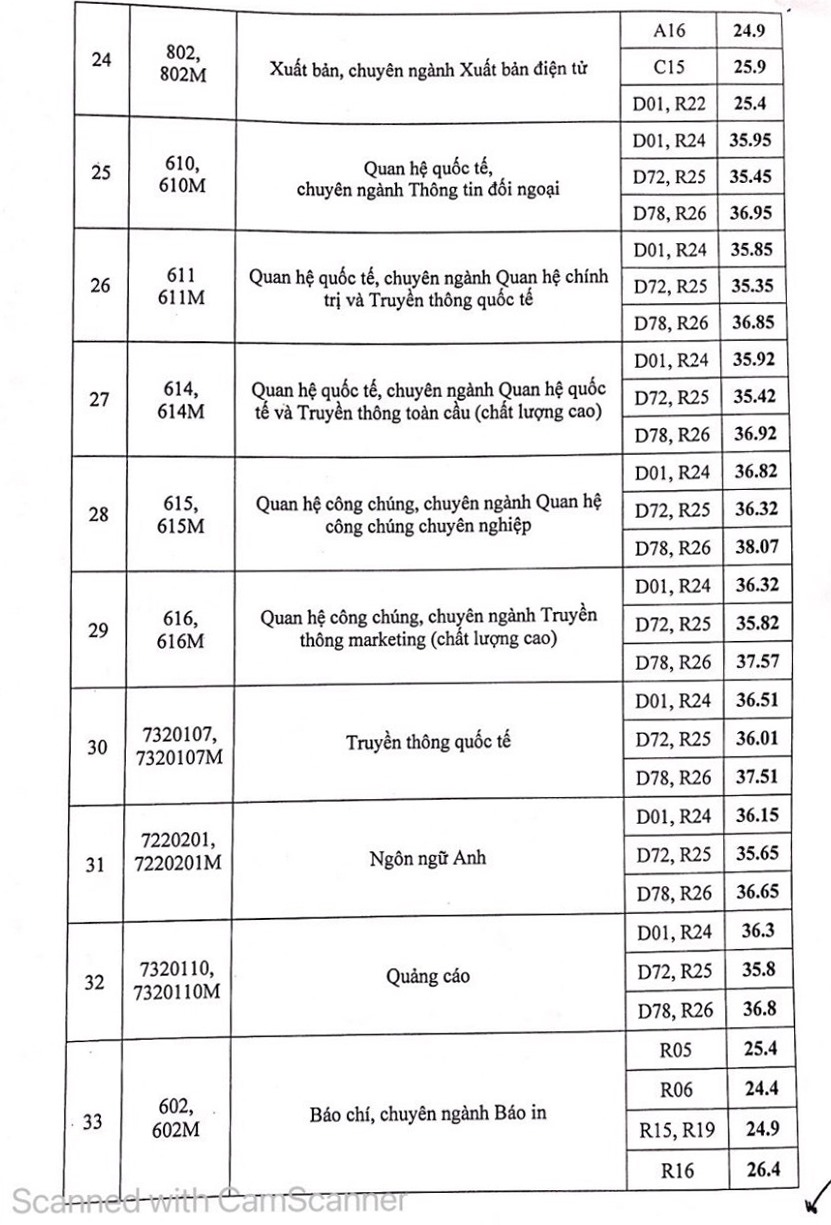 Theo thang 40, ngành Quan hệ công chúng chuyên nghiệp có điểm cao nhất với 37,6 điểm, xét theo tổ hợp khối D78, R26. Xếp thứ hai là chuyên ngành Lịch sử với 37,5 điểm, xét theo tổ hợp C19. Mức điểm chuẩn cao thứ ba là chuyên ngành Báo truyền hình với 37,19 điểm xét tổ hợp D78, R26.