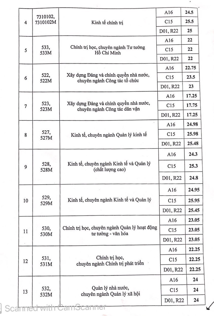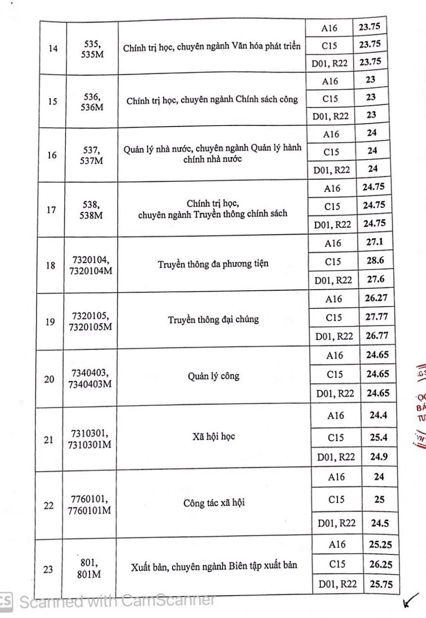 Theo thang điểm 30, ngành Truyền thông đa phương tiện lấy điểm cao nhất 29,25 xét tổ hợp C15. Ngành Xây dựng Đảng và chính quyền nhà nước lấy điểm chuẩn thấp nhất 22,8 xét tổ hợp A16.