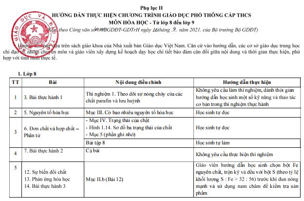 Chương trình giảm tải môn Hóa THCS 2021-2022