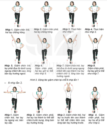 * Chuyển giao nhiệm vụ học tập: - Cho HS xem hình ảnh động tác giậm chân tại chỗ; thu chân, tay cao bài TD nhịp điệu - GV thị phạm động tác - GV yêu cầu đồng loạt HS thực hiện động tác. - GV gọi 1-2 HS tập mẫu để HS trong lớp theo dõi, tập theo. - GV lưu ý HS khi thực hiện các động tác - GV theo dõi, sửa sai cho HS * Kết luận, nhận định - Nhận xét, bổ sung, sửa sai và lấy điểm ĐGTX cho HS |