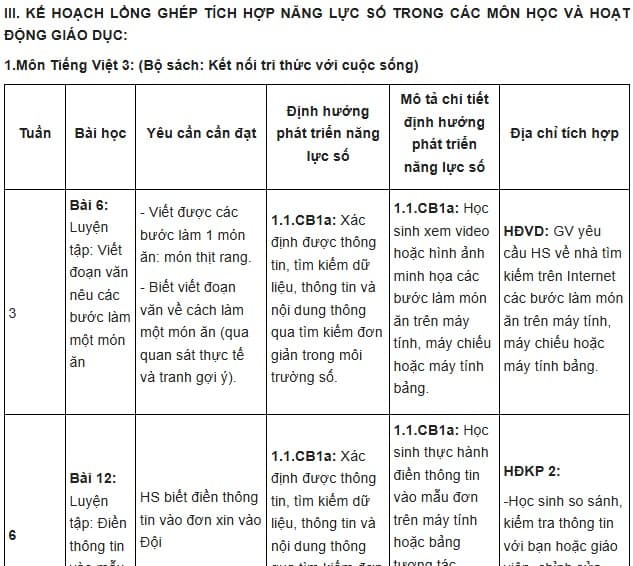 III. KẾ HOẠCH LỒNG GHÉP TÍCH HỢP NĂNG LỰC SỐ TRONG CÁC MÔN HỌC VÀ HOẠT ĐỘNG GIÁO DỤC: