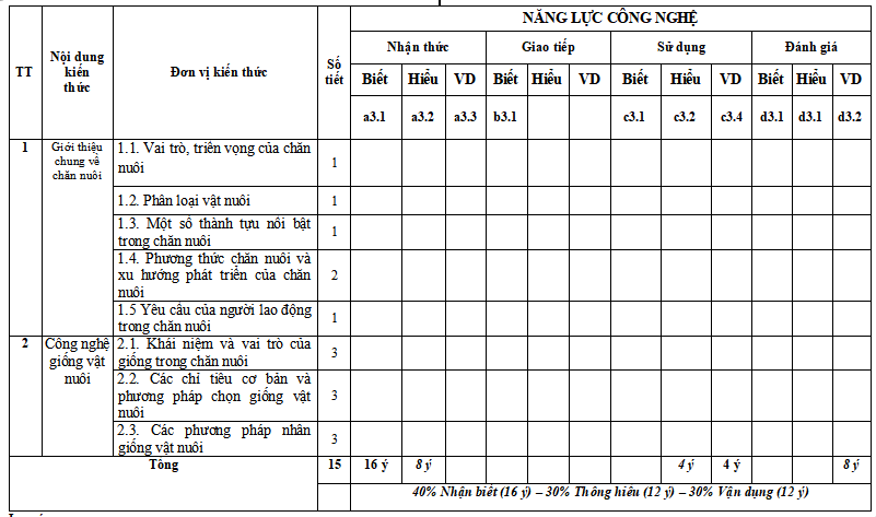 Ma trận đề thi Công nghệ 11 Chăn nuôi Kết nối tri thức (Cả năm)