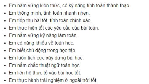 Em làm tốt toán cộng trừ, viết phép tính tốt. Em có tiến bộ cần làm toán đúng nhiều hơn. Em thông minh, tính toán nhanh nhẹn, chính xác. Em vận dụng kiến thức tốt vào các bài thực hành. Em chăm chỉ, học toán tốt. Em vận dụng tốt bảng cộng trừ vào thực hành. Em tiếp thu bài tốt, tính toán chính xác. Em làm bài tốt, nắm vững các kiến thức, kĩ năng làm toán. Em tích cực học toán. Em thực hiện tốt các yêu cầu của bài toán. Em tính nhanh nhẹn các dạng toán. Em có năng khiếu về toán học. Em làm toán nhanh, cẩn thận. Em tính toán nhanh, chính xác, có ý thức học tập tốt. Em có kĩ năng tính toán tốt. Em tính toán cẩn thận, chính xác. Em thực hiện tốt các phép tính cộng trừ đã học. Em tính đúng nhưng còn chậm. Kĩ năng tính toán của em chưa nhanh, hay bôi xoá khi làm bài. Em nên ôn luyện các kĩ năng cộng, trừ, so sánh số. Em tính toán cẩn thận hơn, rèn thêm sắp xếp số. Em rèn tính cộng, trừ cẩn thận hơn. Em cần đọc kĩ yêu cầu đề bài và tính toán cẩn thận hơn. Em rèn kĩ năng so sánh số. Em rèn xếp thứ tự số. Em rèn thao tác tính nhanh hơn nhé! Em rèn viết phép tính phù hợp yêu cầu bài nhé! |