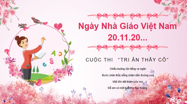 Powerpoint ngày Nhà giáo Việt Nam 20/11 được HoaTieu.vn chia sẻ sau đây gồm các mẫu slide ppt, hình nền và trò chơi Powerpoint tìm hiểu về ngày 20/11, tri ân thầy cô đẹp ấn tượng và ý nghĩa. Hoatieu.vn mời các bạn tải mẫu slide PowerPoint ngày 20-11 về máy để sử dụng làm Powerpoint chủ đề Ngày Nhà giáo Việt Nam 20/11, chuẩn bị cho lễ mít tinh tri ân thầy cô, tiết học trên lớp thêm phần sôi động, hấp dẫn.