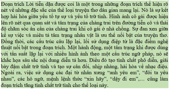 Đề bài: Hãy viết một đoạn văn (khoảng 10 – 12 dòng), phân tích và làm rõ một đặc điểm nổi bật của truyện thơ dân gian qua đoạn trích Lời tiễn dặn.
