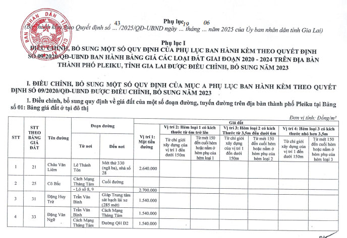 Theo đó, tại Quyết định 43/2025/QĐ-UBND thì Uỷ ban nhân dân tỉnh Gia Lai đã quyết định điều chỉnh Bảng giá đất Gia Lai tại một địa phương như sau:
