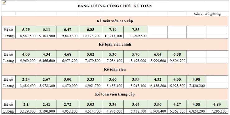 Cụ thể, bảng lương của công chức kế toán như sau: