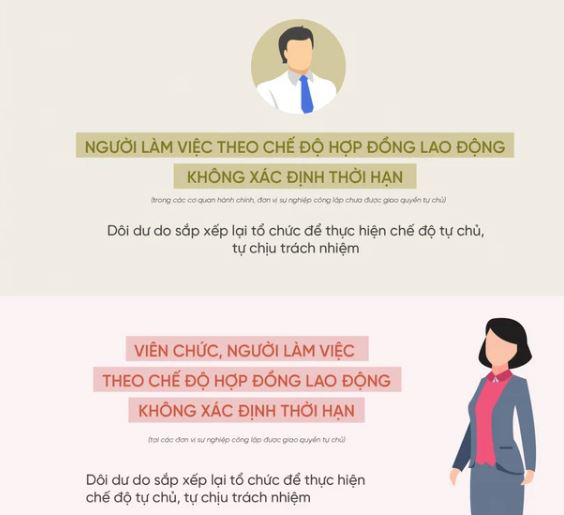 (8) Người làm việc theo chế độ hợp đồng lao động không xác định thời hạn trong các cơ quan hành chính, đơn vị sự nghiệp công lập chưa được giao quyền tự chủ dôi dư do sắp xếp lại tổ chức theo quyết định của cơ quan có thẩm quyền hoặc do đơn vị sự nghiệp công lập sắp xếp lại tổ chức bộ máy, nhân sự để thực hiện chế độ tự chủ, tự chịu trách nhiệm về thực hiện nhiệm vụ, tài chính, tổ chức bộ máy và nhân sự.