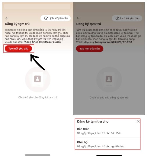 Bước 3: Tạo yêu cầu: Chọn "Tạo mới yêu cầu" để bắt đầu khai báo thông tin. Khi chọn Tạo mới yêu cầu, bạn chọn đăng ký cho bản thân hoặc khai hộ khi thực hiện khai thay cho người khác.