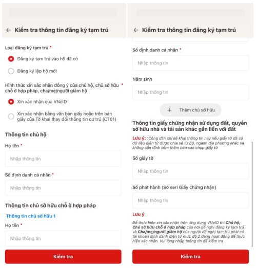 Tại cửa sổ mở ra người đăng ký điền đầy đủ các thông tin cần thiết (các mục có dấu * không được bỏ trống), đơn cử như loại đăng ký tạm trú (đăng ký vào hộ đã có hoặc lập hộ mới) họ tên chủ hộ, số định danh cá nhân, thông tin chủ sở hữu chỗ ở hợp pháp…