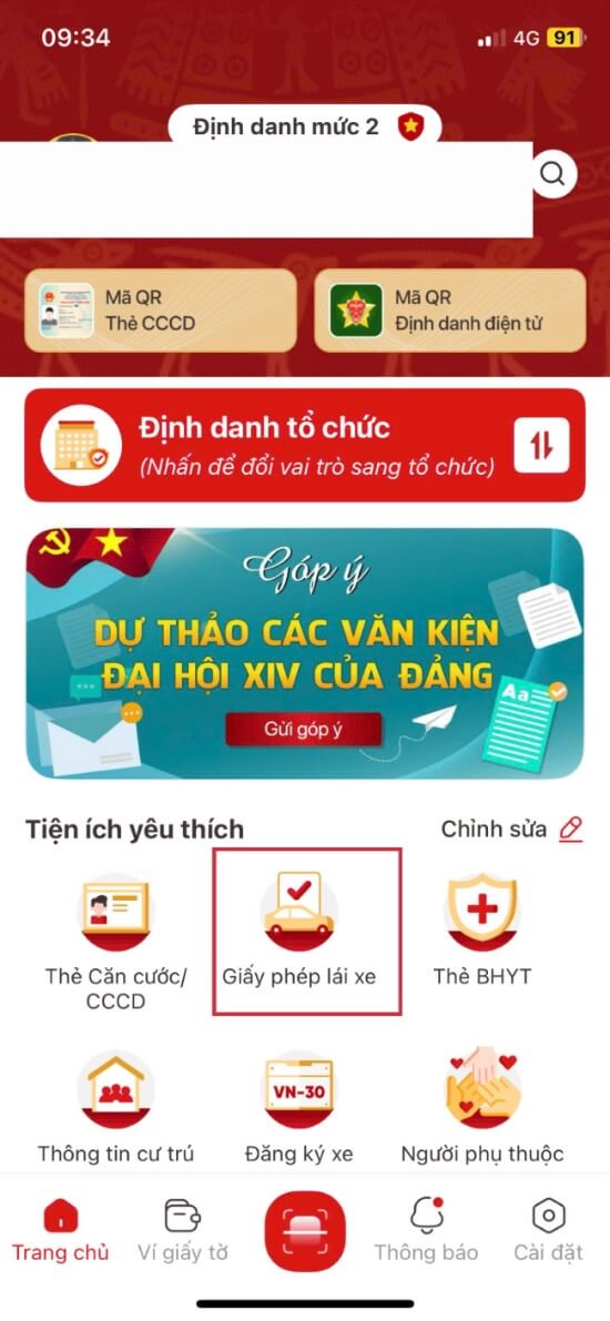 Bước 2: Tại Giao diện chính, chọn "Giấy phép lái xe".