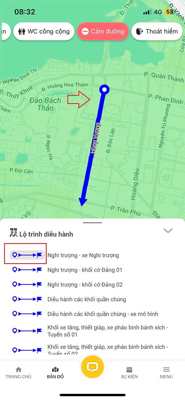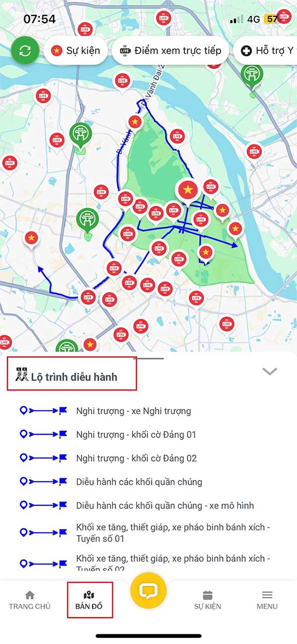 Bước 2: Truy cập vào App A80 Tự Hào Việt Nam > Chọn biểu tượng "Bản đồ" > Chọn Lộ trình diễu hành để tiến hành tra cứu theo từng tuyến/ khối