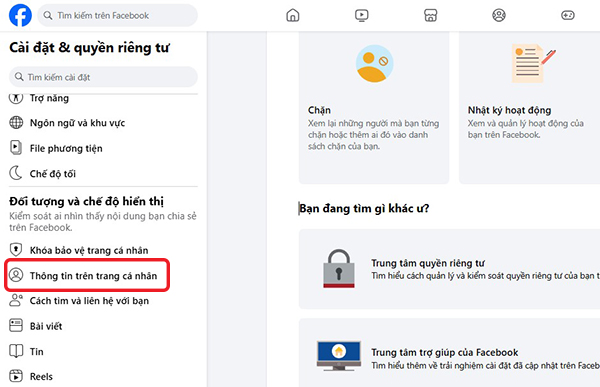 Bước 4: Kéo xuống tới mục "Đối tượng và chế độ hiển thị" và nhấn chọn "Thông tin trên trang cá nhân"