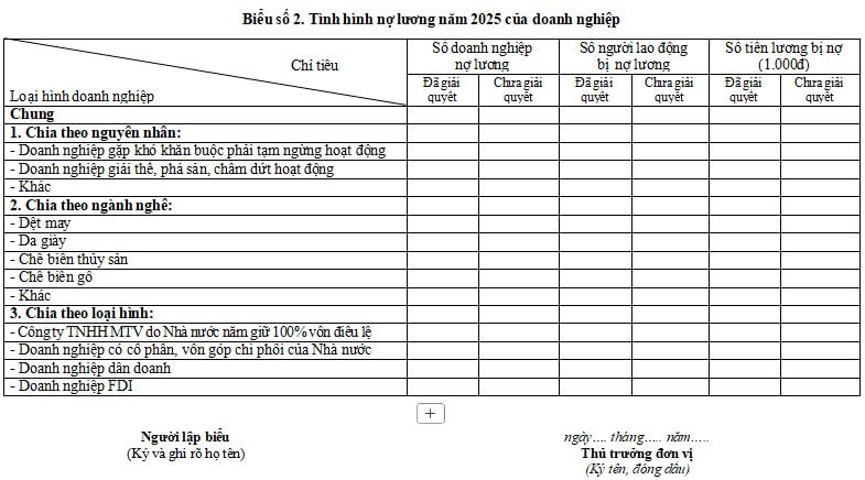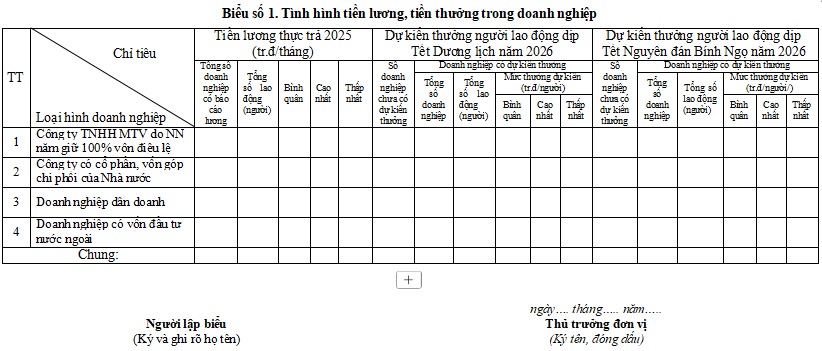 4. Chủ trì, phối hợp với Ban quản lý khu công nghiệp, khu kinh tế, khu chế xuất khảo sát, nắm tình hình tiền lương, nợ lương, quan hệ lao động năm 2025; kế hoạch thưởng theo kết quả sản xuất kinh doanh trong doanh nghiệp dịp tết Dương lịch và tết Nguyên đán năm 2026; tổng hợp số liệu (theo mẫu đính kèm) và gửi về Bộ Nội vụ (qua Cục Tiền lương và Bảo hiểm xã hội) trước ngày 25/12/2025.