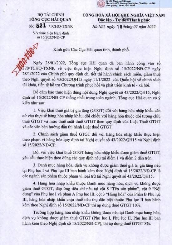 Ngày 18/2/2022, Tổng cục Hải quan đã ban hành Công văn số 521/TCHQ-TXNK về việc thực hiện Nghị định số 15/2022/NĐ-CP ngày 28/1/2022 của Chính phủ quy định chi tiết thi hành chính sách miễn, giảm thuế theo Nghị quyết số 43/2022/QH13 ngày 11/1/2022 của Quốc hội về chính sách tài khóa, tiền tệ hỗ trợ Chương trình phục hồi và phát triển kinh tế - xã hội.