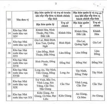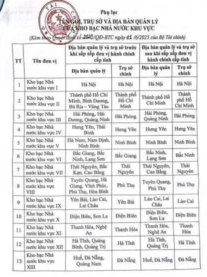 Theo Phụ lục Tên gọi, trụ sở và địa bàn quản lý của Kho bạc Nhà nước khu vực ban hành kèm theo Quyết định 2020/QĐ-BTC năm 2025 thì danh sách 20 Kho bạc Nhà nước khu vực như sau: