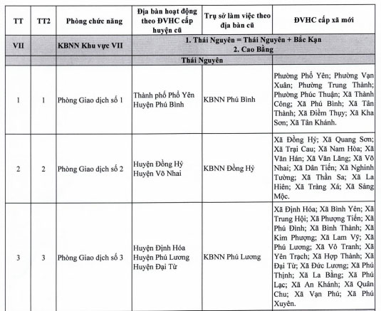 Danh sách 15 Phòng Giao dịch Kho bạc Nhà nước khu vực 7 (Thái Nguyên, Cao Bằng) từ 1/7/2025