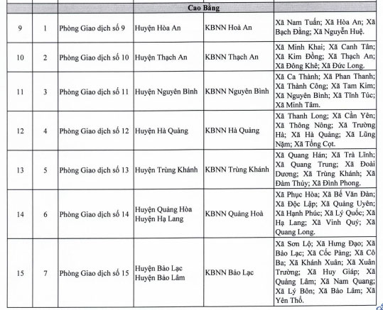 Từ ngày 01/7/2025, Kho bạc Nhà nước khu vực 7 quản lý tỉnh Thái Nguyên, Cao Bằng chính thức hoạt động với 15 phòng giao dịch, theo Quyết định 5770/QĐ-KBNN năm 2025 của Bộ Tài chính. Các phòng giao dịch này, được đánh số từ 1 đến 15, đảm nhiệm chức năng quản lý ngân sách nhà nước, thực hiện thu chi và thanh toán trên địa bàn tỉnh. Quy định này nhằm đảm bảo tính minh bạch, hiệu quả trong quản lý tài chính công, đồng thời hỗ trợ người dân và tổ chức thực hiện các giao dịch tài chính thuận lợi. Các bạn vui lòng liên hệ các phòng giao dịch để được hướng dẫn chi tiết.