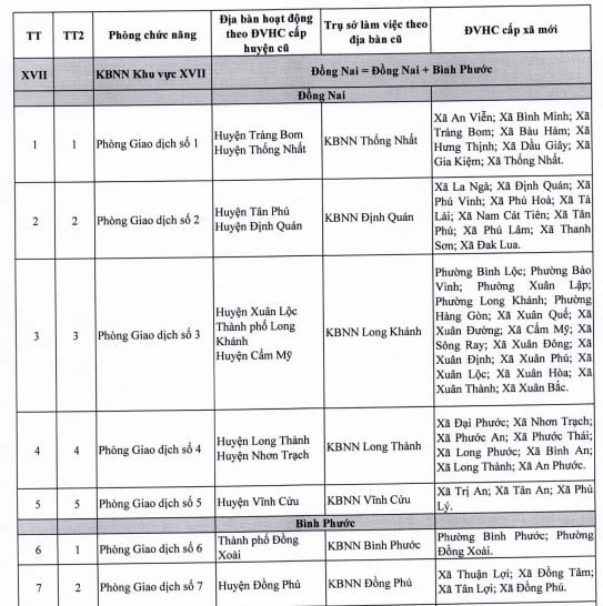 Theo đó, Phụ lục Cơ cấu tổ chức của Kho bạc Nhà nước khu vực XVII quy định chi tiết danh sách 11 Phòng giao dịch thuộc Kho bạc Nhà nước khu vực 17 (Đồng Nai) từ 01/7/2025.