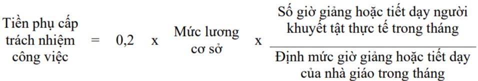 - Mức 0,2 so với mức lương cơ sở áp dụng đối với nhà giáo được giao nhiệm vụ tổ phó chuyên môn hoặc tổ phó bộ môn theo quy định của pháp luật; nhà giáo trực tiếp giảng dạy người khuyết tật theo phương thức giáo dục hòa nhập trong các cơ sở giáo dục không phải là trường chuyên biệt, trung tâm hỗ trợ phát triển giáo dục hòa nhập theo số giờ giảng hoặc tiết dạy người khuyết tật thực tế;