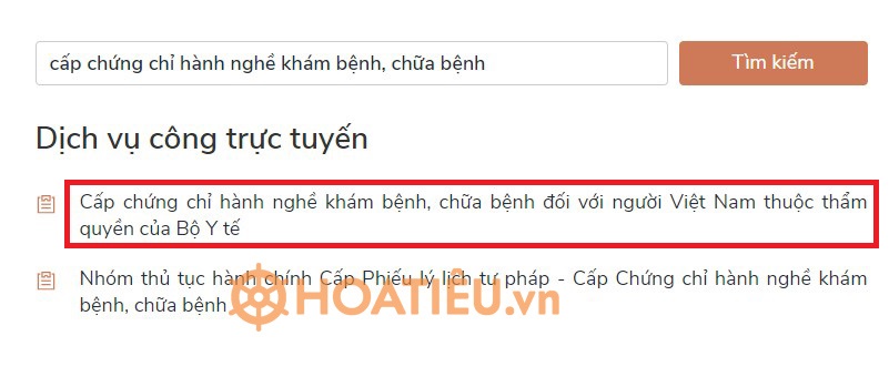 + Nhập từ khóa tìm kiếm: "cấp chứng chỉ hành nghề khám bệnh, chữa bệnh" và nhấn Tìm kiếm. Sau đó chọn Cấp chứng chỉ hành nghề khám bệnh, chữa bệnh đối với người Việt Nam thuộc thẩm quyền của Bộ Y tế.
