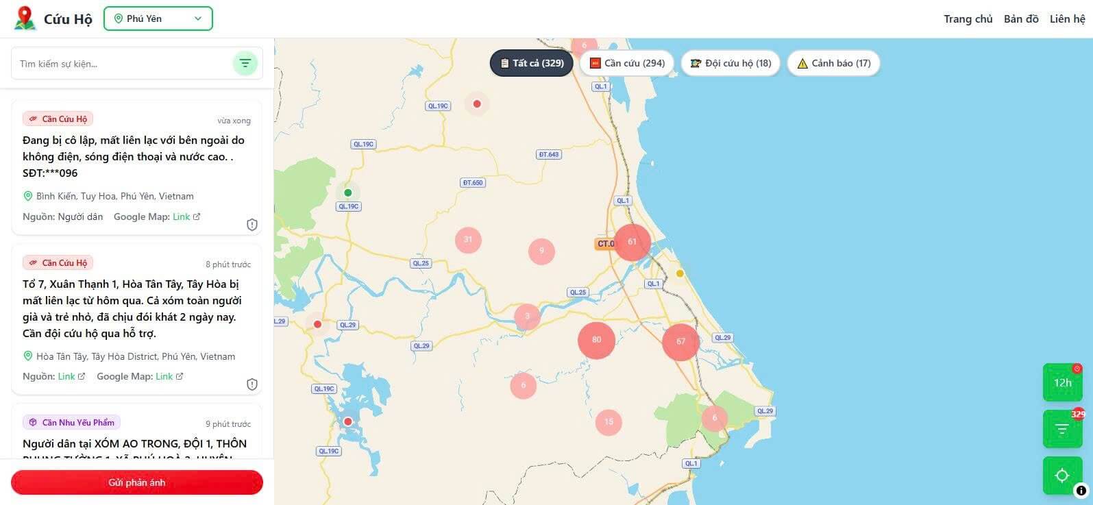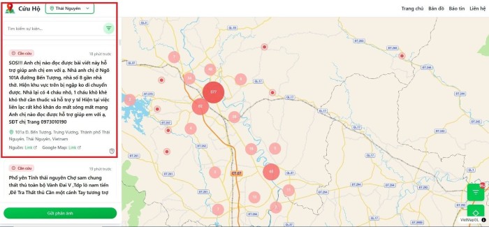 Bước 2: Tại góc trái màn hình mục "Cứu hộ" sẽ có thông tin người dân cầu cứu được tổng hợp từ các trang/nhóm facebook theo thời gian thực.