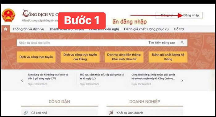 Bước 1: Đăng nhập vào Cổng dịch vụ công quốc gia tại địa chỉ: https://dichvucong.gov.vn