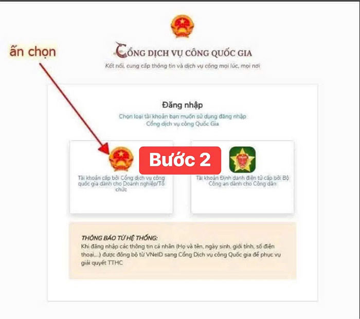 Bước 2: Nhấn chọn “Tài khoản cấp bởi Cổng Dịch vụ công quốc gia dành cho Doanh nghiệp/Tổ chức”
