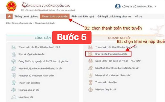 Bước 5: Chọn mục “Thanh toán trực tuyến”, rồi nhấn “Khai và nộp thuế doanh nghiệp”