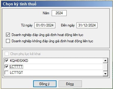 - Chọn năm tính thuế và kỳ tính thuế đến thời điểm quyết định giải thể.