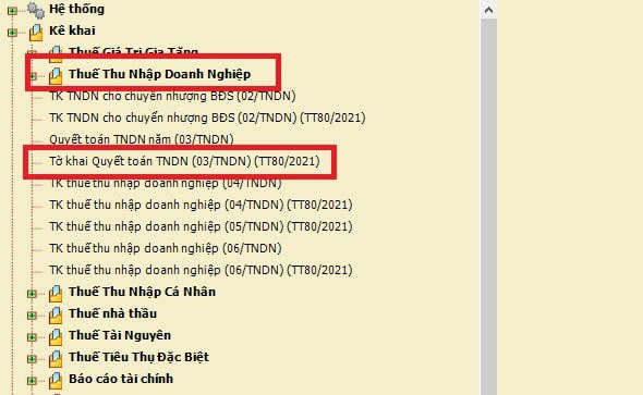 - Ở thanh menu chọn: Thuế Thu nhập Doanh nghiệp -> "Tờ khai quyết toán thuế TNDN (03/TNDN)(TT80/2021)".