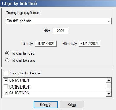 - Chọn kỳ tính thuế cuối cùng đến thời điểm quyết định giải thể.