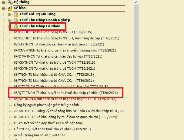 - Vào menu: Thuế TNCN → "05/QTT-TNCN Tờ khai quyết toán thuế thu nhập cá nhân (TT80/2021)".