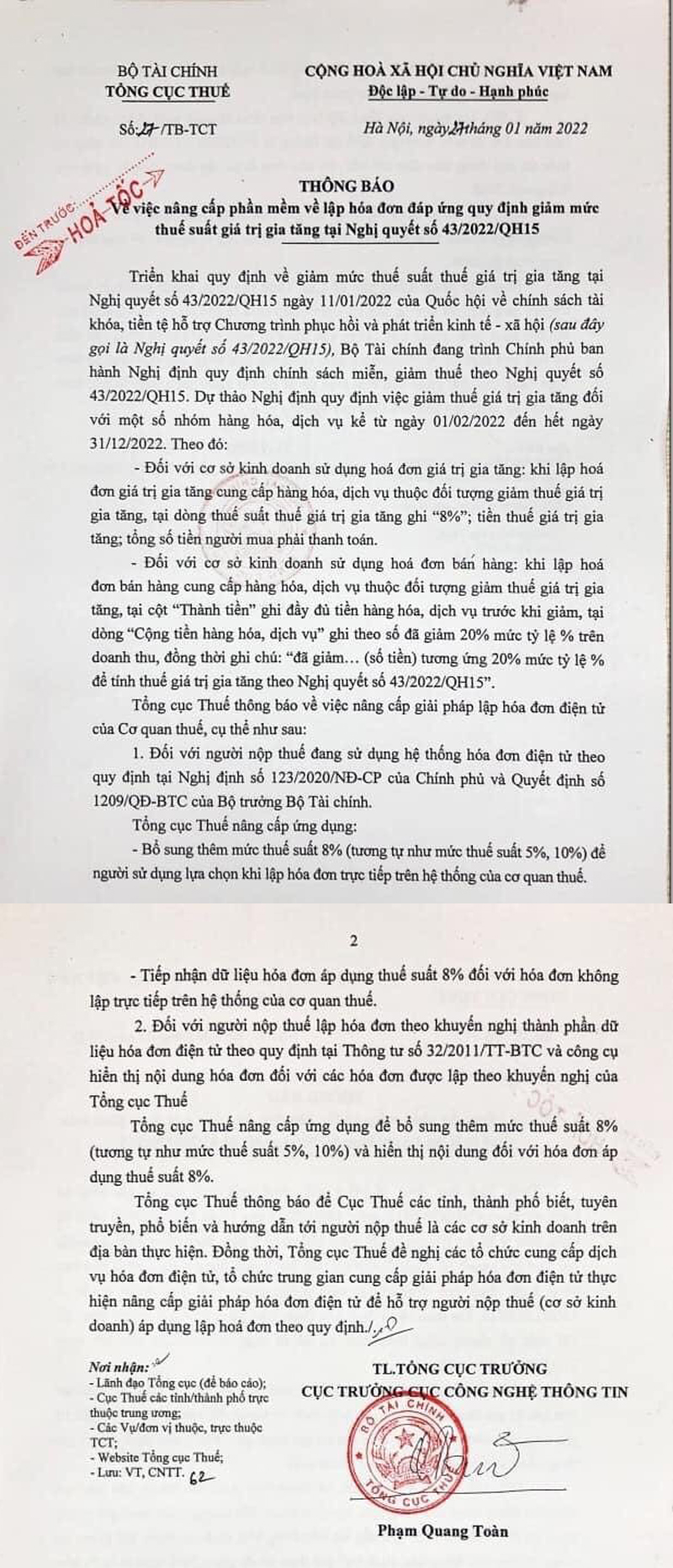 Tổng cục Thuế cũng đã có thông báo về việc nâng cấp phần mềm lập hóa đơn GTGT đáp ứng quy định giảm mức thuế suất GTGT tại Nghị quyết 43/2022/QH15 như sau: