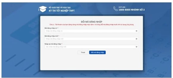 Bước 2: Sau khi đăng nhập, màn hình Đổi mã đăng nhập sẽ được hiển thị. Thí sinh thực hiện đổi mã đăng nhập (đổi mật khẩu) bằng cách nhập mật khẫu cũ, mật khẩu mới và bấm nút Đổi mã đăng nhập