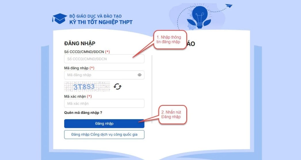Bước 1: Thí sinh nhập thông tin CMND/CCCD/ĐDCN và mã đăng nhập (mật khẩu) mà điểm TNHS cung cấp hoặc trong mail đã nhận và nhấn Đăng nhập